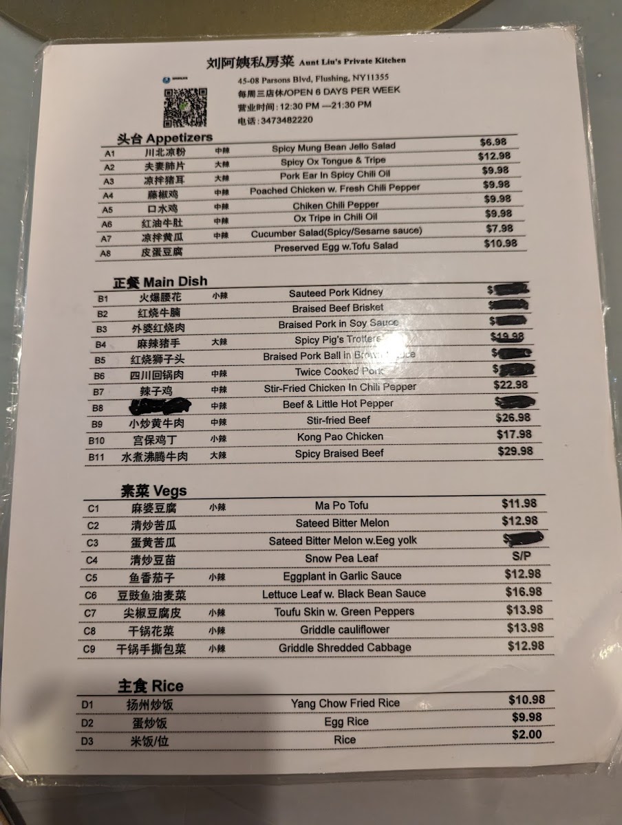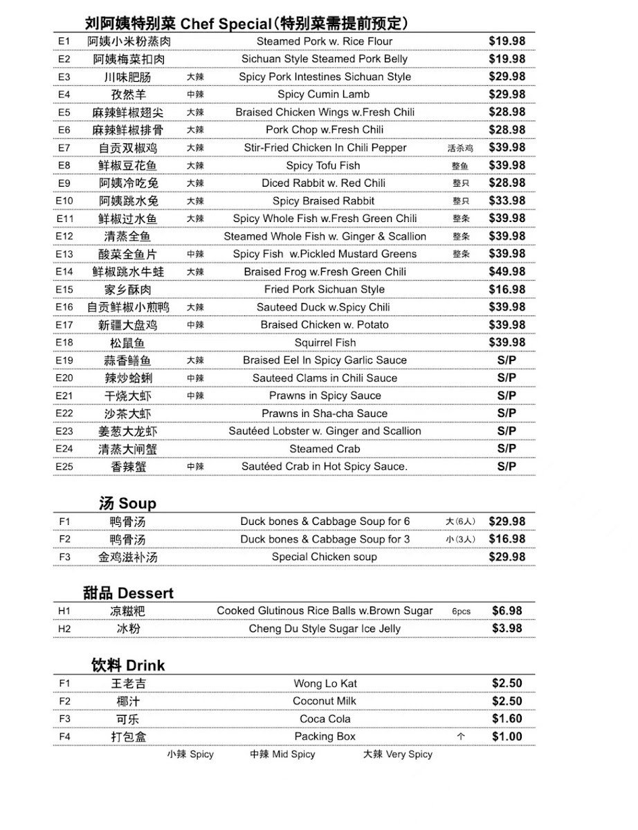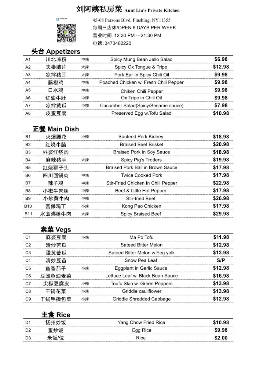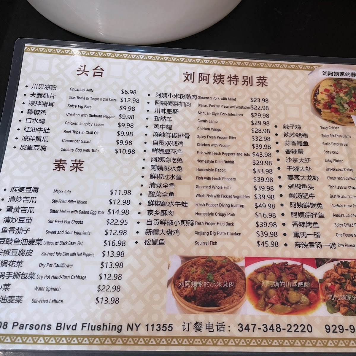 刘阿姨私房菜 Aunt Liu's Private Kitchen Menu